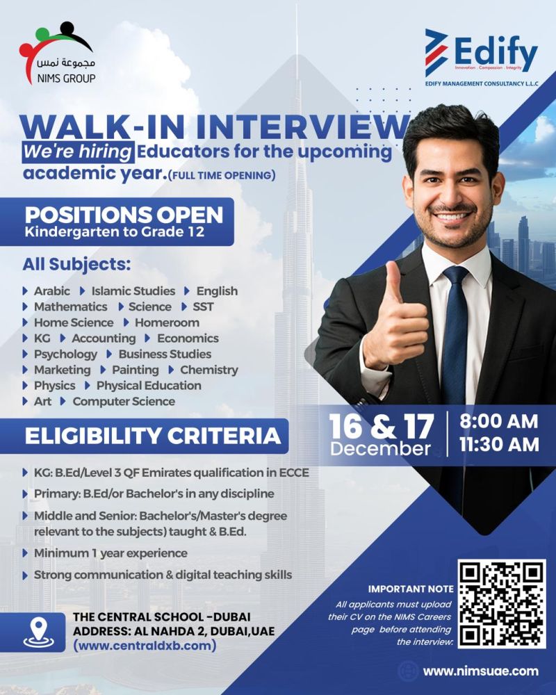 KG: B.Ed/Level 3 QF Emirates qualification in ECCE. Primary: B.Ed/or Bachelor's in any discipline. Middle and Senior: Bachelor's/Master's degree relevant to the subjects taught & B.Ed.