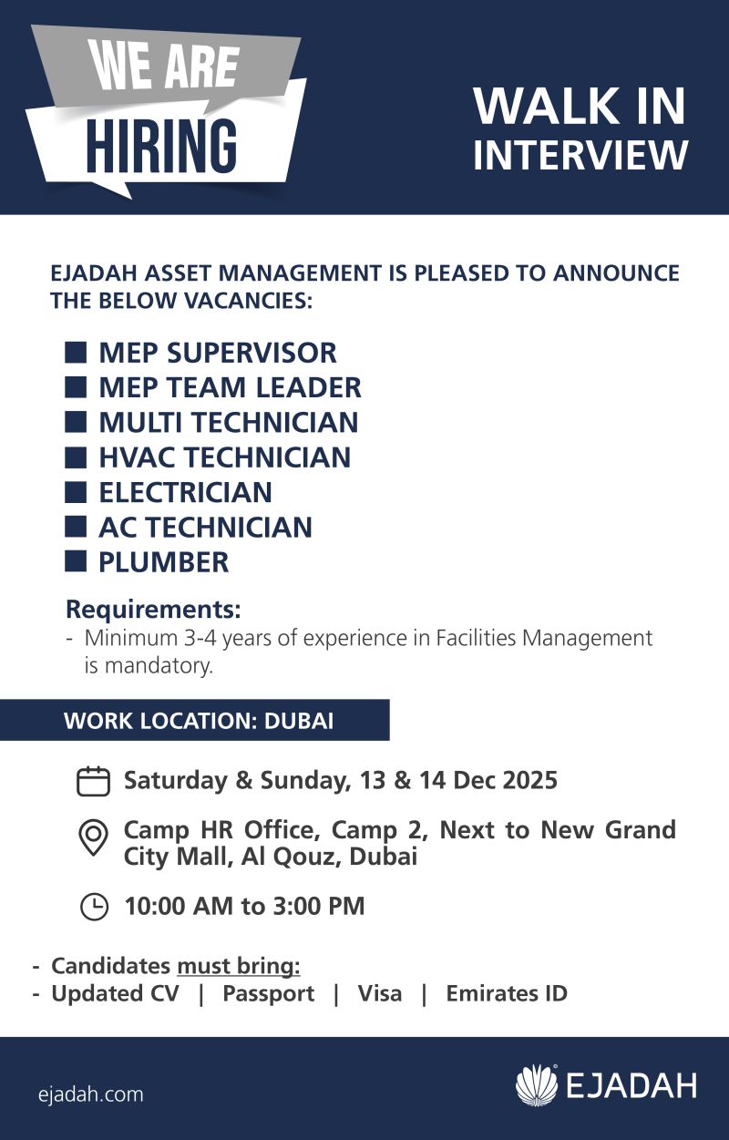 Candidates must bring: Updated CV | Passport | Visa | Emirates ID.