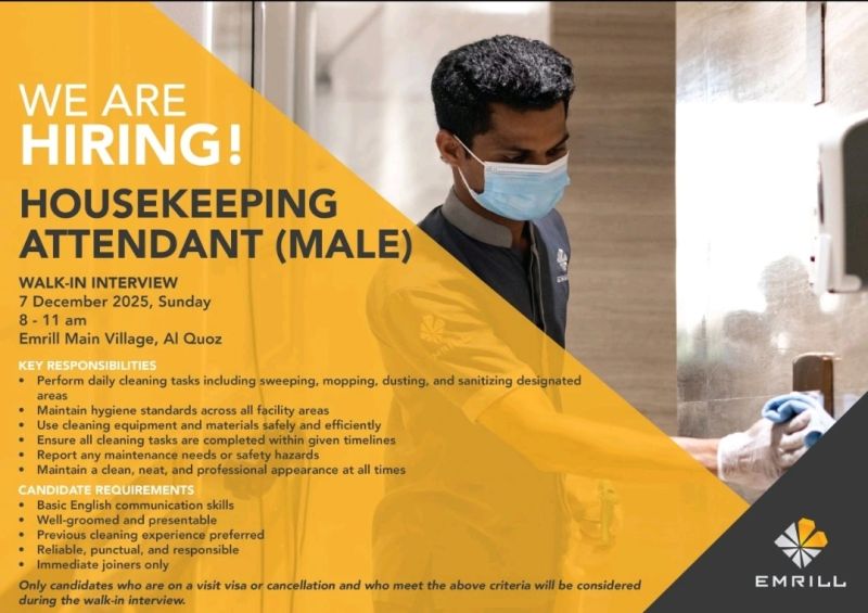 Other Requirements: Basic English communication skills, well-groomed and presentable, reliable, punctual, and responsible, immediate joiners only. Only candidates who are on a visit visa or cancellation visa and who meet the above criteria will be considered during the walk-in interview.