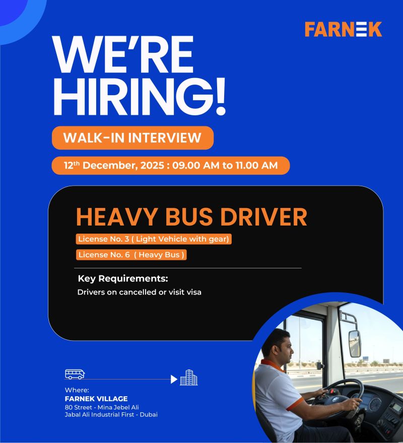 Must have UAE License No. 3 (Light Vehicle with gear) and License No. 6 (Heavy Bus). Drivers on cancelled or visit visa.